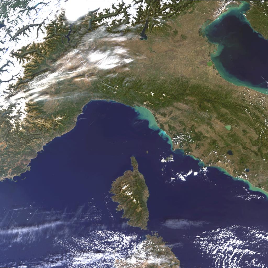 (Click on image to enlarge) This MERIS image centres over Northern-Central Italy and Corsica.